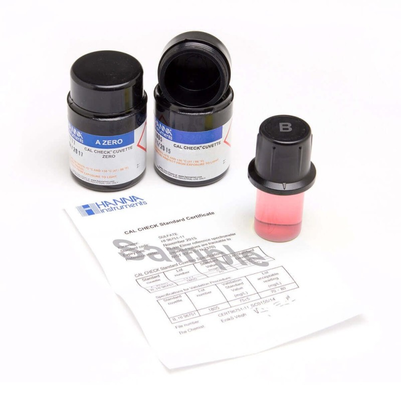 Los estándares CAL Check™ HI96713-11 de fosfato intervalo bajo proporcionan una solución sencilla para calibrar y validar el fotómetro de HI96713 para fosfato intervalo bajo. Este conjunto de estándares de alta calidad se fabrica en nuestras instalaciones de última tecnología y se suministra con un certificado de análisis. El certificado de análisis proporciona el número de lote, los valores de referencia y la fecha de caducidad para la trazabilidad al certificar el fotómetro HI96713.