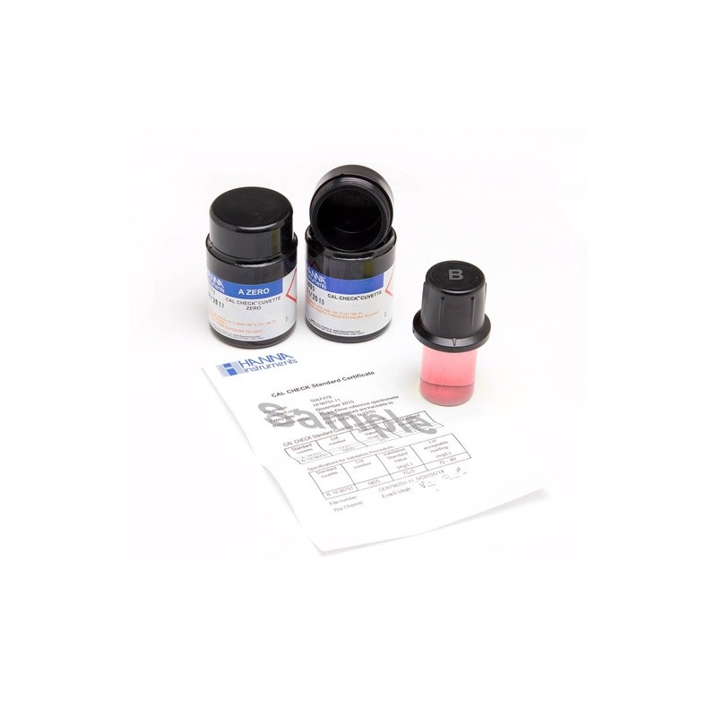 Los estándares CAL Check™ HI96771-11 de cloro libre intervalo bajo y cloro intervalo ultra alto proporcionan una solución sencilla para calibrar y validar el fotómetro portátil HI96771. Los estándares se utilizan tanto para el cloro libre intervalo bajo de 0.00 a 5.00 mg/L (ppm) como para el cloro intervalo ultra alto de 0 a 500 mg/L (ppm). Este conjunto de estándares de alta calidad se fabrica en nuestras instalaciones de última tecnología y viene con un certificado de análisis. El certificado de análisis proporciona el número de lote, los valores de referencia y la fecha de caducidad para validar y calibrar el fotómetro HI96771.